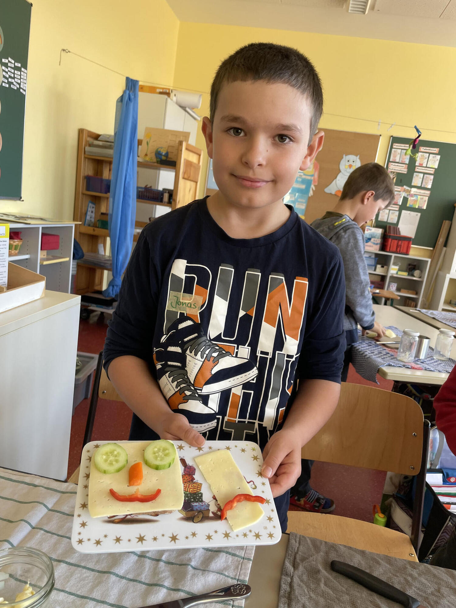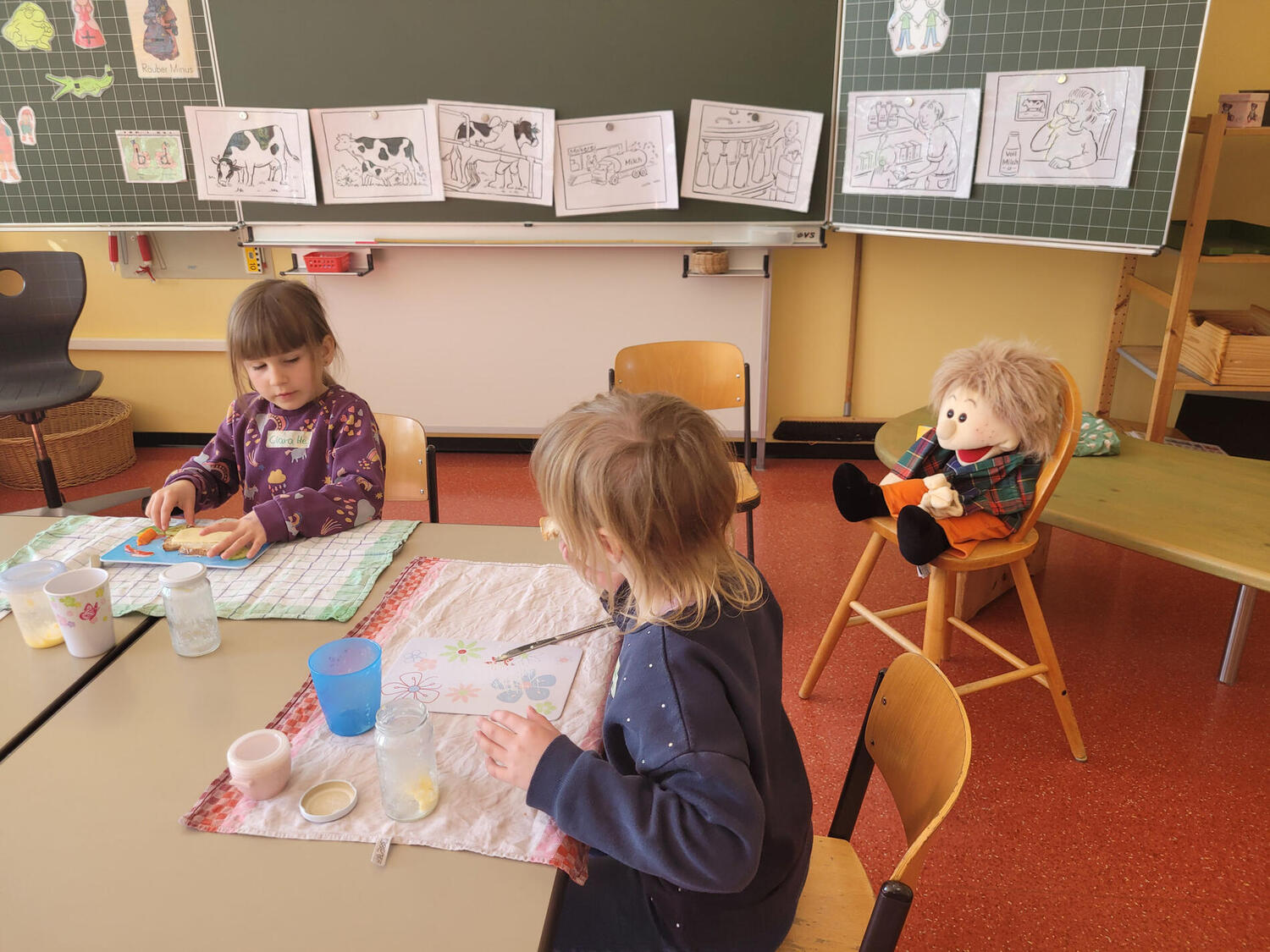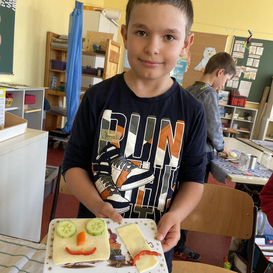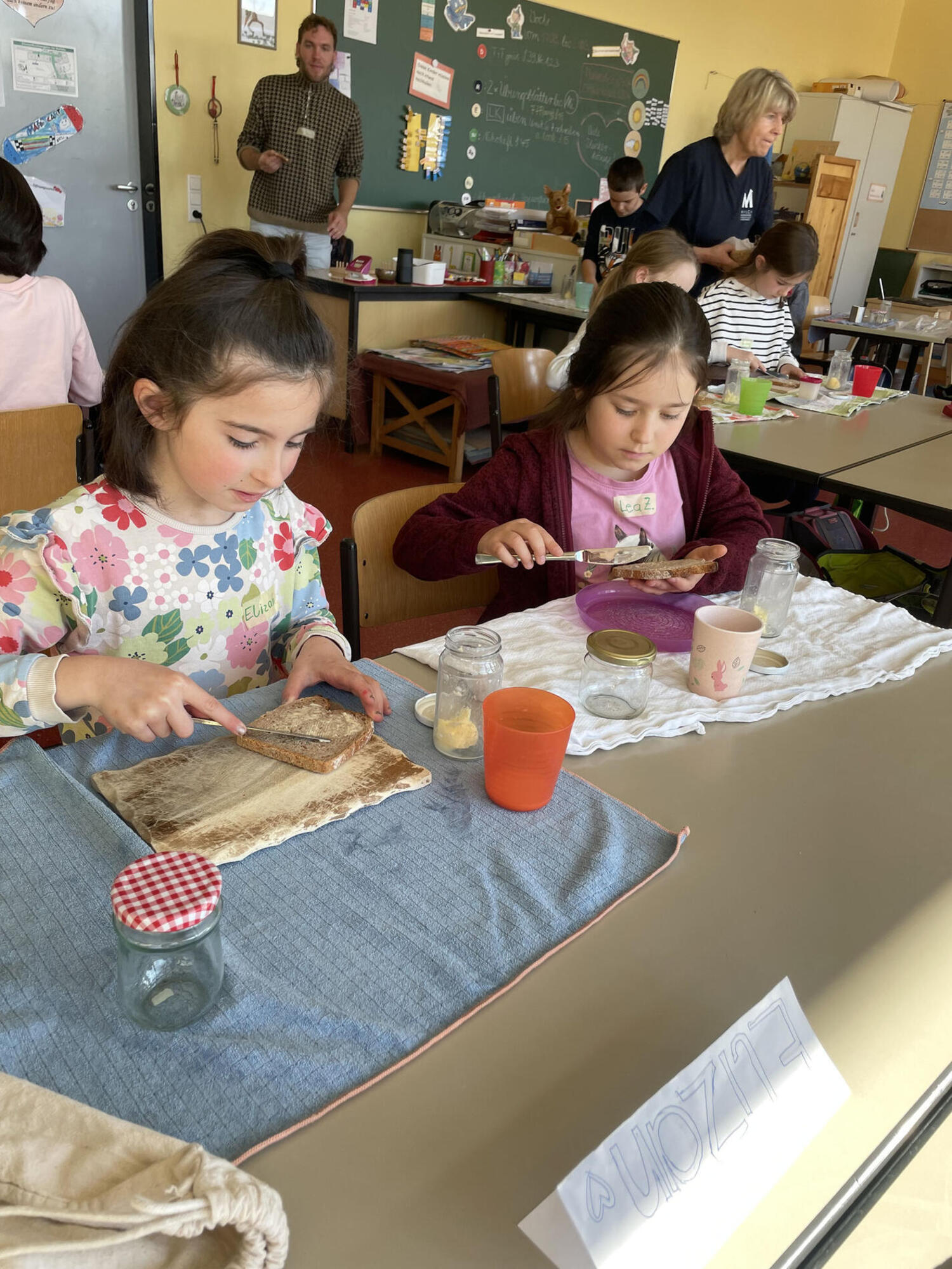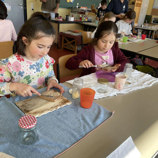 Ein weiteres Highlight war die Butterherstellung. Die Kinder schüttelten ihre kleinen Gläser kräftig, um die Butter entstehen zu lassen. Die dabei gewonnene süße Buttermilch wurde mit Begeisterung probiert und für sehr lecker befunden. Anschließend wurde die selbstgemachte Butter auf gesunde Vollkornscheiben gestrichen und mit Käse sowie frischem Gemüse dekoriert. Die Stille im Klassenzimmer während des Frühstücks zeigte, dass es allen schmeckte.