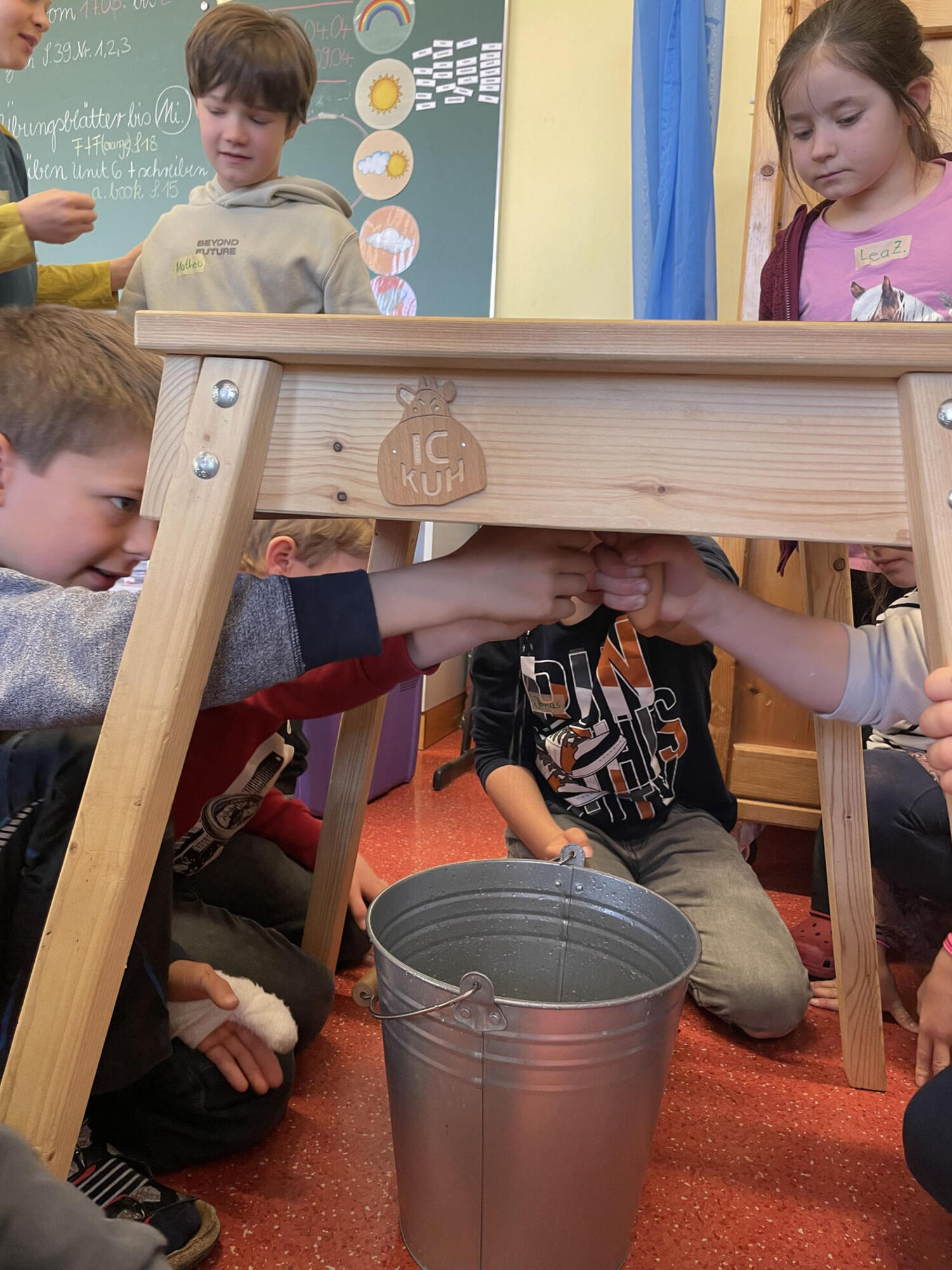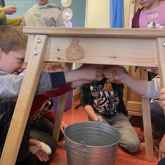 Die Milchbotschafterin berichtete aus ihrem Alltag auf einem landwirtschaftlichen Betrieb und stand den Kindern für Fragen und den Austausch von Wissen zur Verfügung. Eine besondere Attraktion war das Melken an der "Holzkuh", das sich als gar nicht so einfach herausstellte – es erforderte einiges an Geschick, um den Eimer zu treffen.